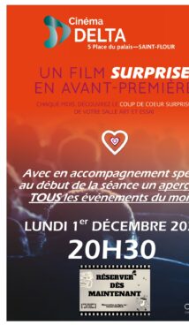 Nous vous proposons chaque mois un film en Avant-Première, dont le titre et le sujet vous sont inconnus jusqu’aux premières images … Ce film a fait l’objet dune présélection par l’Association Française des Cinémas Art et Essai (AFCAE). Quatre ou cinq films sont proposés, l’équipe de programmation en a choisi un pour vous. Seul Le film peut être en VF ou en VOST, cette mention est précisée. Laissez-vous surprendre …